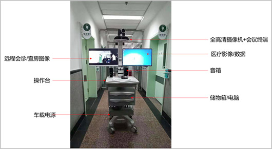 依據系統所配備的5G醫療會診/查房推車,可以實現視頻監護、遠程會診、視頻查房及遠程探視等功能。